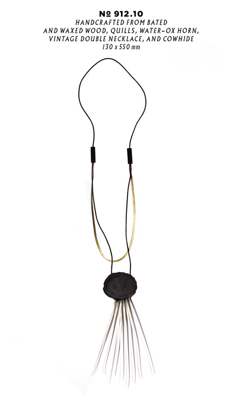 Juergen Veit, handcrafted from bated and waxed wood, quills, water-ox horn, vintage doublE necklace, and cowhide