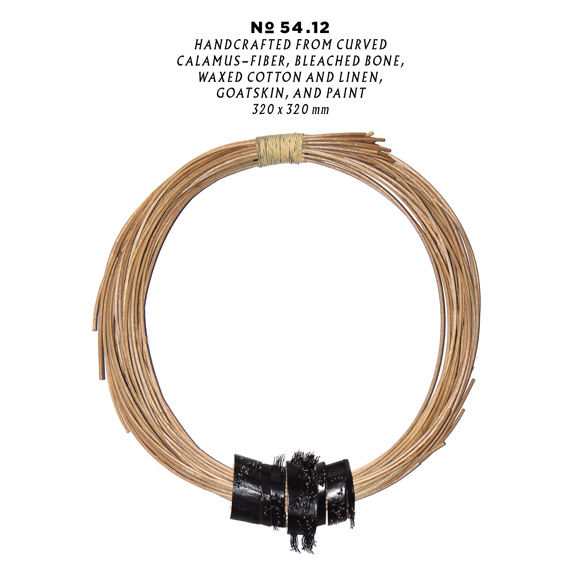Juergen Veit, handcrafted from curved calamus-fiber, bleached bone, waxed cotton and linen, goatskin, and paint