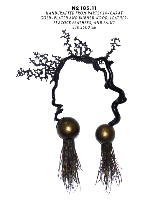 Juergen Veit, handcrafted from partly 24-carat gold-plated and burned wood, leather, peacock feathers, and paint